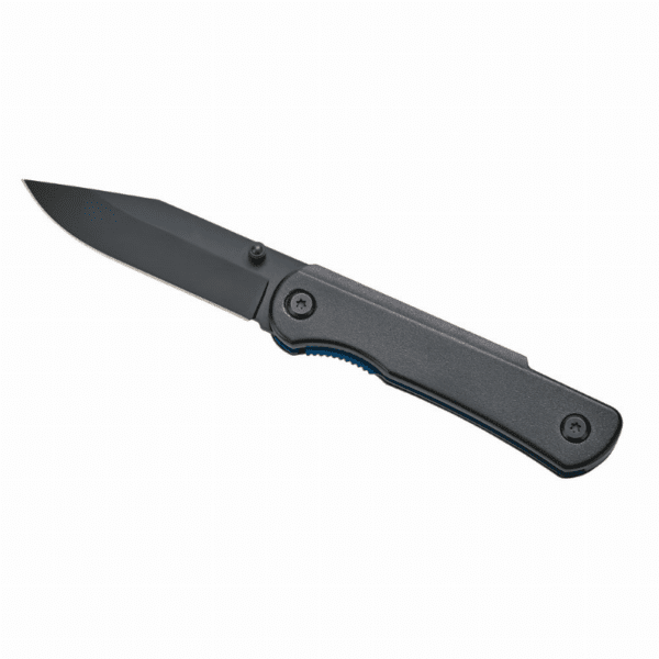 This black pocket knife has blue accents around the interior of the knife and a black stainless steel blade. The knife locks in place when the blade is fully opened, release the lock with the push of your thumb to fold the blade back inside. The folded knife measures 4″ L and opened measures 7″. Add optional engraving on the aluminum handle for a great contrast! Gift boxed.